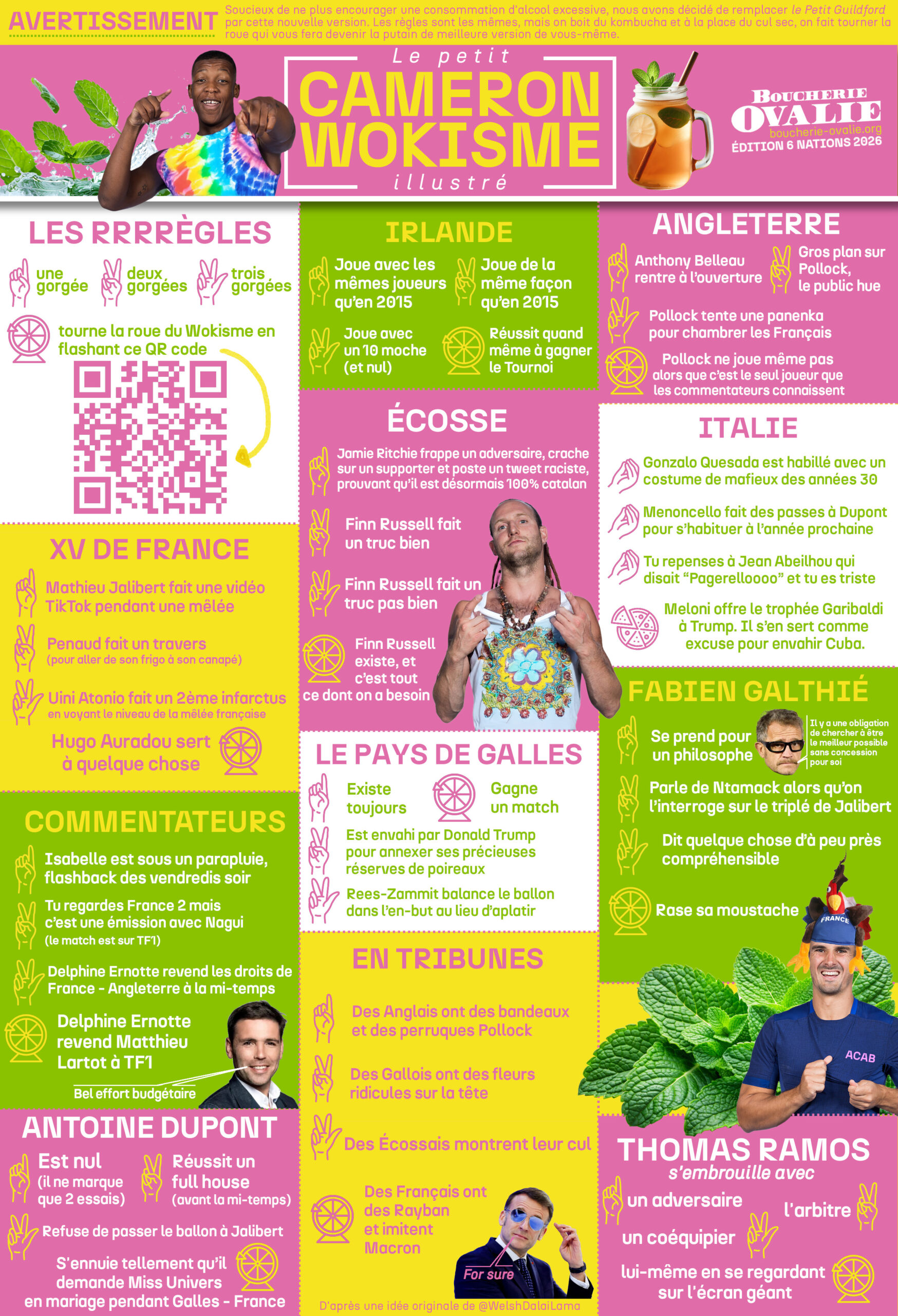 Le Petit Cameron Wokisme Illustré, édition 2026par La Boucherie 04 février 2026 % Petit Cameron Wokisme Illustré, an II. Cette année encore, on prolonge le Dry Ricky Januarie de quelques semaines et on profite du Tournoi des 6 Nations pour parfaire sa cure detox. Au programme : des gorgées de thé matcha ou de kombucha, et une roue de gages wokistes à faire à la place des culs secs (suivez le QR Code ou cliquez ici pour la découvrir). Après des années à vous démonter, il est maintenant temps de vous déconstruire. Allez, bon tournoi !